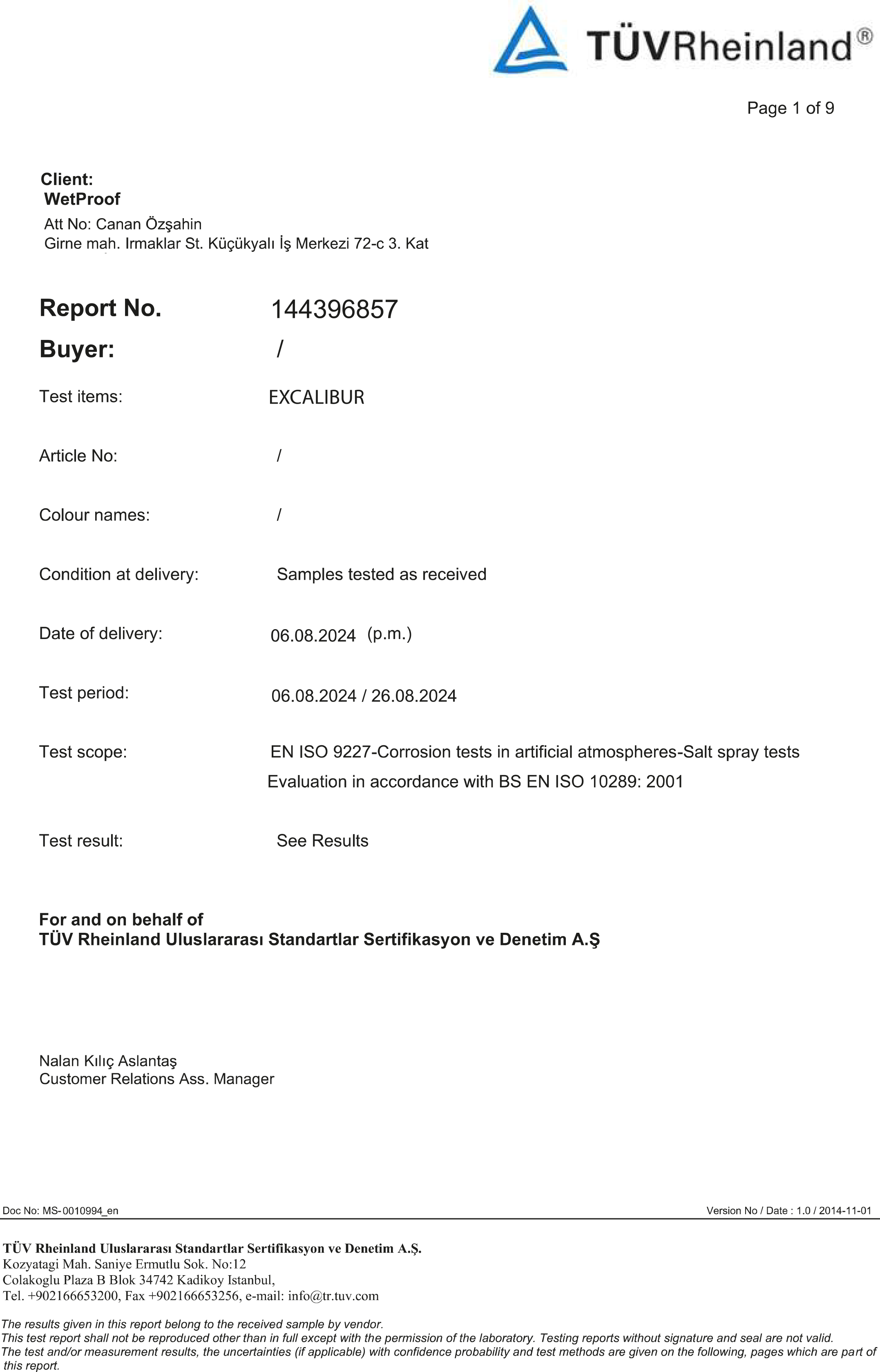 Excalibur NanoFilm, TÜV tarafından sertifikalandırılmıştır ve EN ISO 9227-1-1 standardı kapsamında korozyon direnci testlerinden başarıyla geçmiştir.